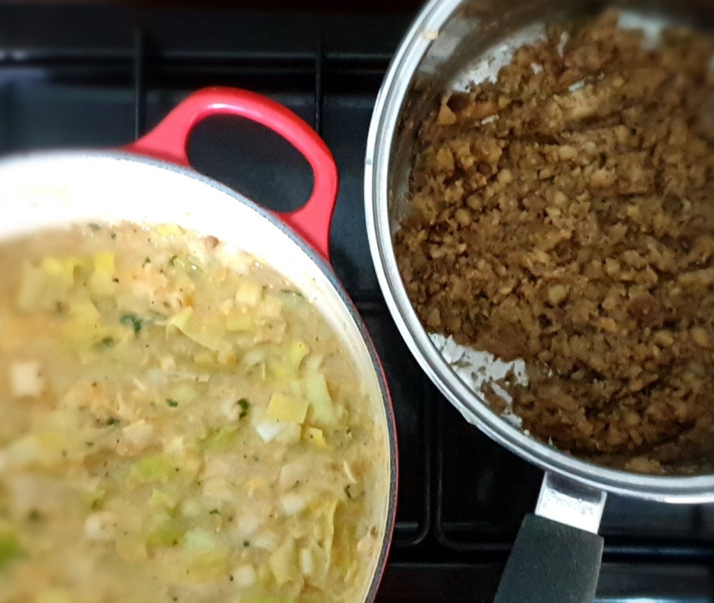 As the water and oil mixture heated, I crushed coriander and cumin seeds with a pestle and mortar and mixed the spices with semolina and emmer flour. Then the whole lot was tipped into the water and oil mixture and stirred to prevent lumps.