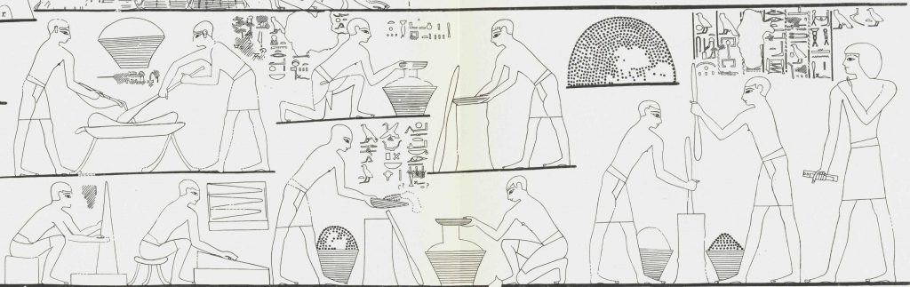 Bottéro gave no translation for the word kanasu (other than “a kind of edible plant”, which doesn’t really narrow it down), but Kelley believes it refers to emmer wheat flour. Emmer was one of the earliest crops domesticated in the Near East, growing naturally throughout the Fertile Crescent before domestication.