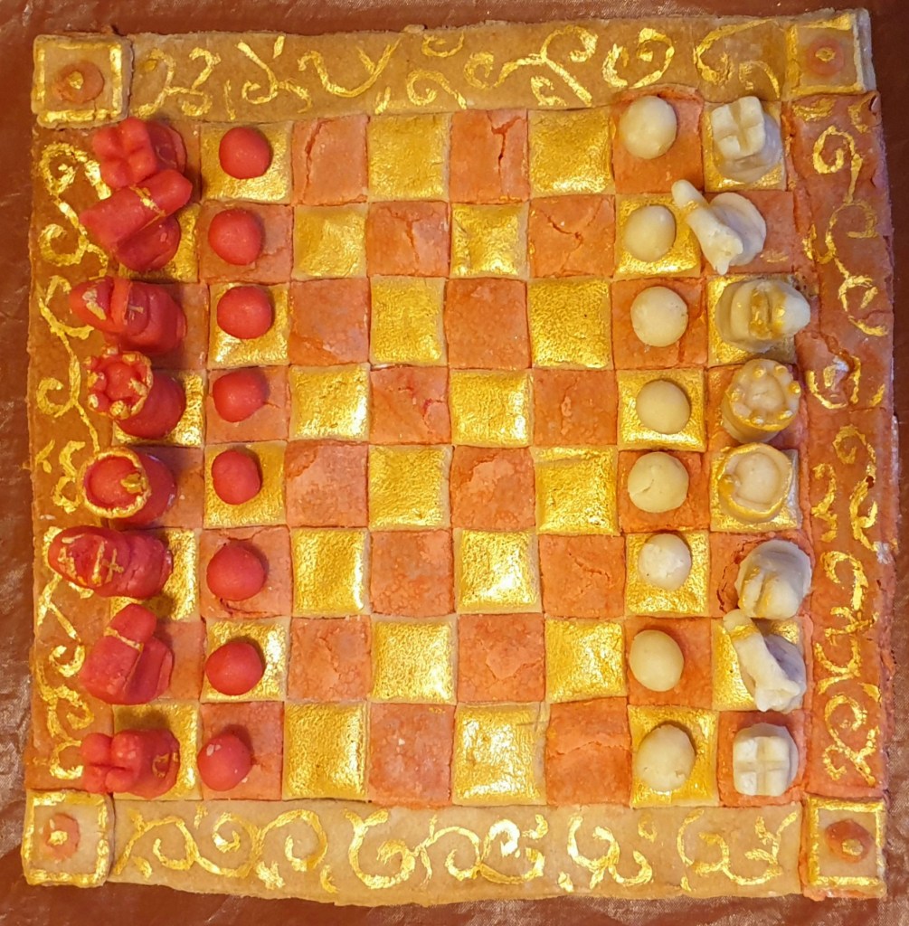 It’s likely Elizabeth’s chessboard would have been decorated with gold leaf to give a red and gold contrast that highlighted her wealth and luxury. I didn’t have any gold leaf and even if I had I’d never be able to afford enough to cover each square properly. What I did have, however, was edible gold metallic paint leftover from a birthday cake I made last month. It wasn’t as elegant as gold leaf but it did the same job and soon my chessboard gleamed regally.