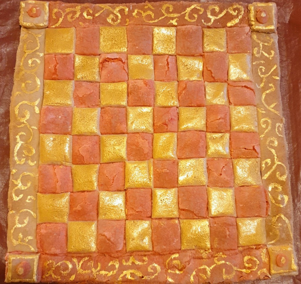 I was then faced with a dilemma: what colour the dough should be. Despite our modern images of them, chess boards weren’t always white and black – quite often they would be white and any other darker colour, most often red. The important thing was to get a deep contrast between a light colour and a darker one.