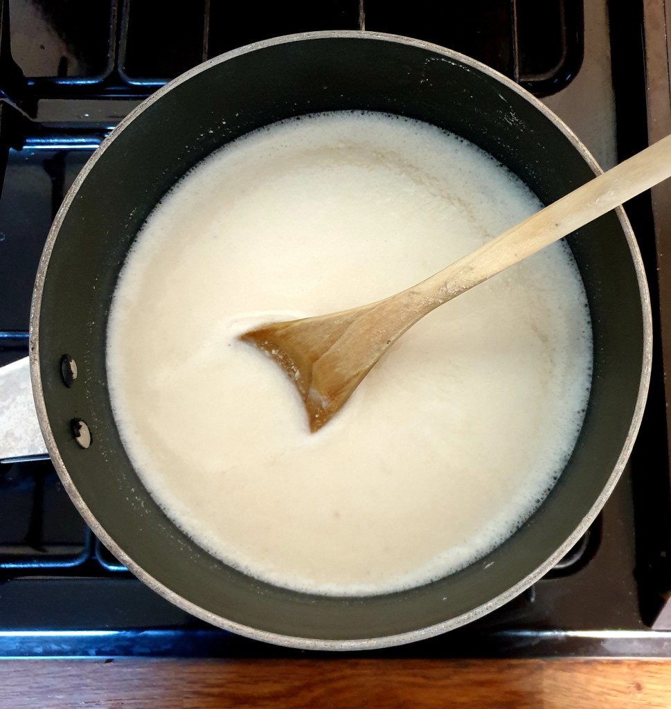 - While the lentils and leek continues cooking, start on the roux. Heat 1 tablespoon of olive oil in a pan and add 2 tablespoons of plain flour. Over a low heat, whisk this together and add about 125ml of milk. Whisk constantly until the roux thickens to the consistency of buttercream, then take off the heat. You may need to add more milk or flour to achieve this thickness.